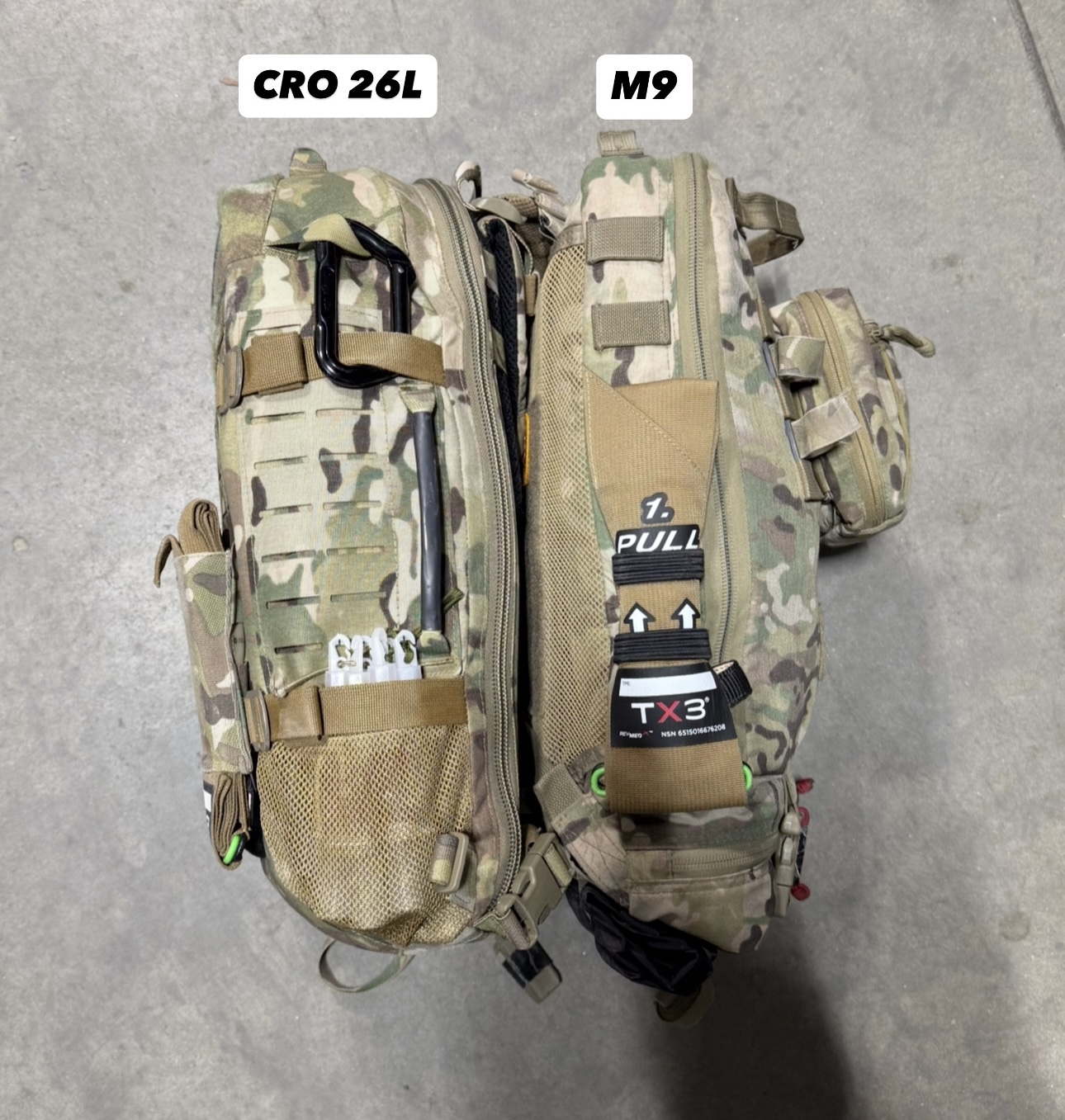 The CRO 26L represents a deliberate step toward the ultimate goal: fitting all required resuscitation equipment for 2-3 combat wounded (an M9 bag equivalent) into a first-line bag capable of carrying two units of blood, and scaling to Prolonged Casualty Care setups (vents, monitors, etc.). It replaces the RATS pack capacity with a fraction of the offset from the body and offers much better space utilization.