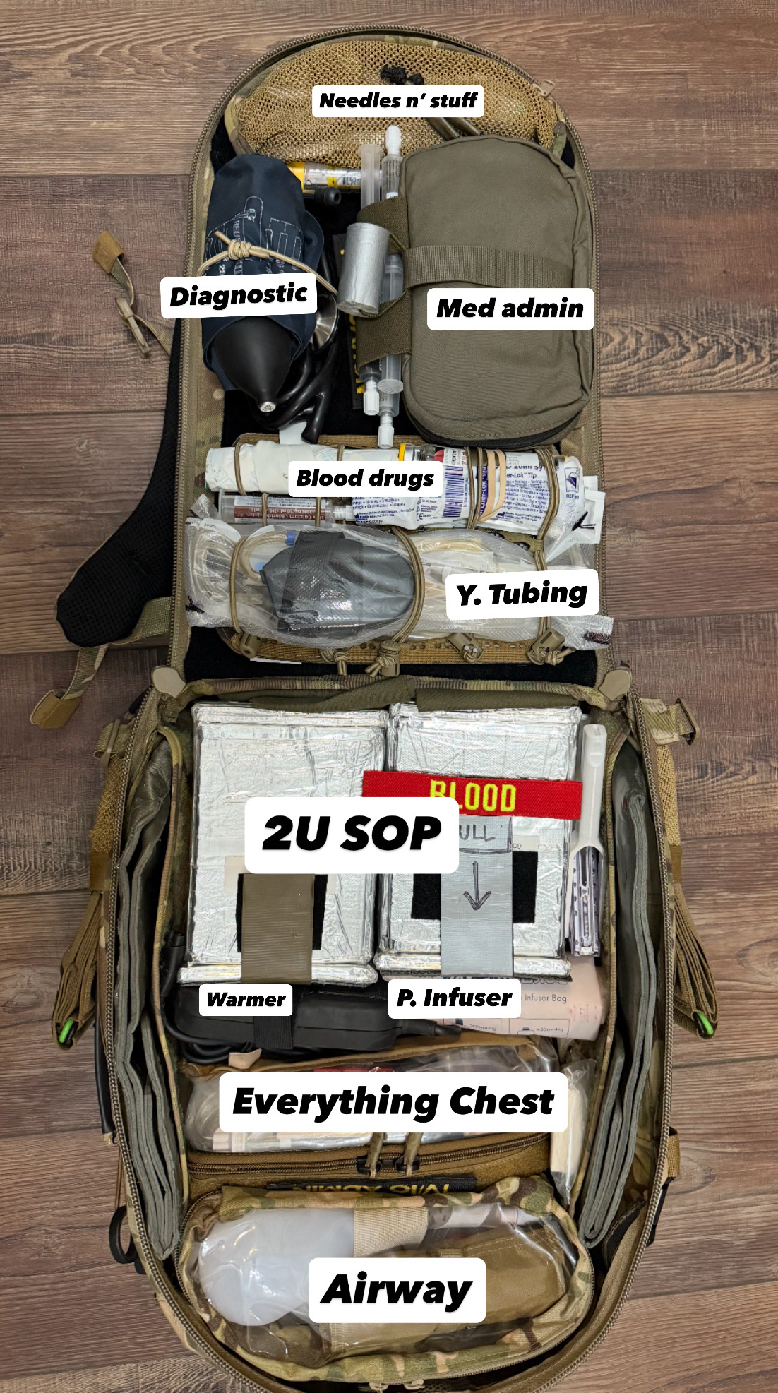 Managing two to three casualties in the real world from a first-line aid bag is not an ultralight solution in the modern age of DCR and Blood Cold Chain. There is an argument to be made that light and fast is an advantage, which is valid, but “heavier” often equals more capable (a Role 2 is more capable than POI, etc). That’s not to say bring the kitchen sink to the POI, just that efficiencies must be incorporated into the first-line bag to adhere to the standard of care, which includes carrying LTOWB (Low-Titer O neg Whole Blood).