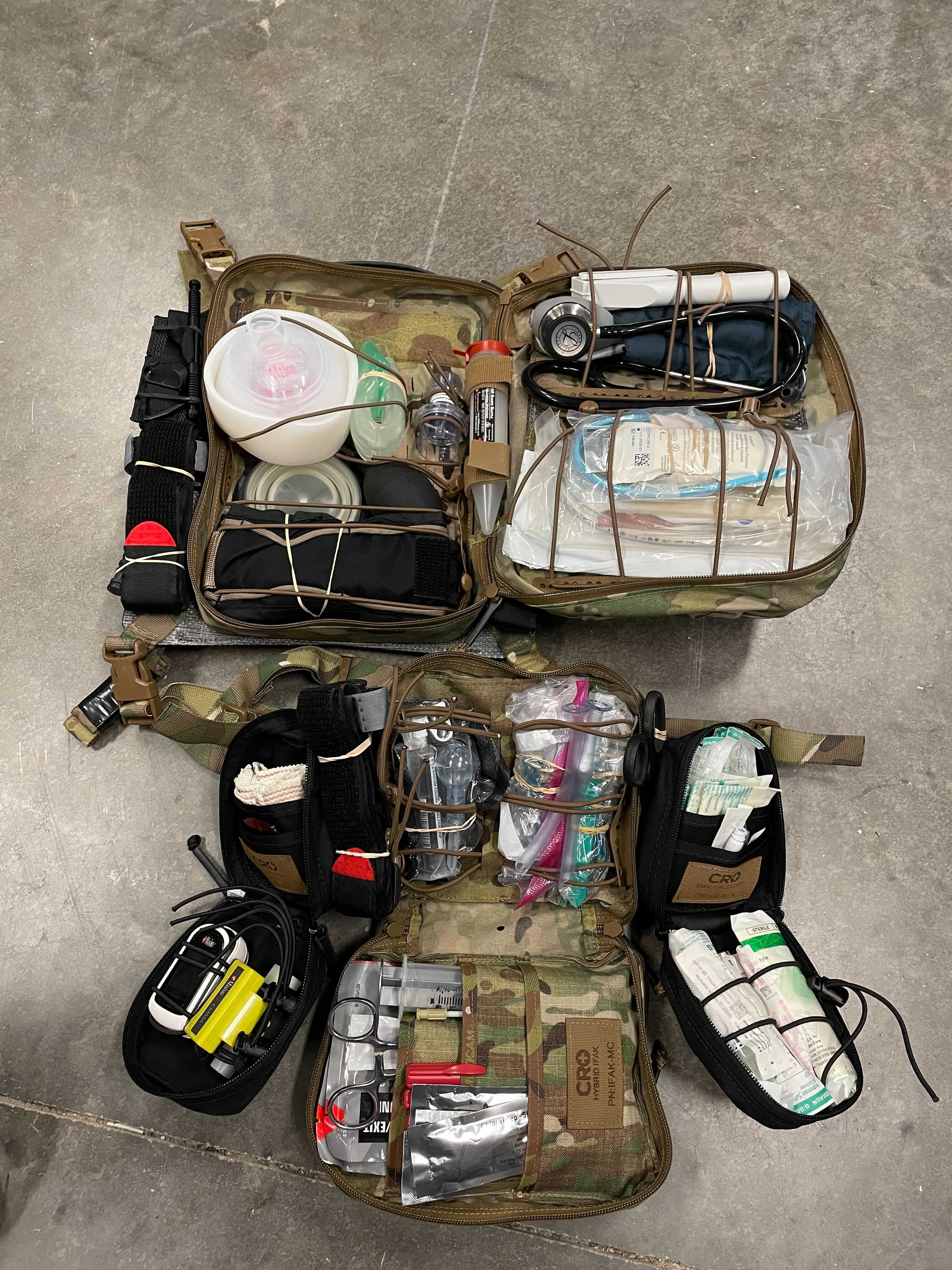 Every member is carrying multiple tourniquets and a well-stocked and inspected IFAK. There is a trained assistant who will carry a similar bag and they won’t be geographically separated. We will each carry a unit of blood in an attached CRO Blood Transport Container and additional personnel have been identified as Type-O, low-titer donors with donor bags. The Platoon Sergeant, Team Sergeant, or Troop Sergeant Major will have the litter and HPMK. MEDEVAC response time and QRF are on standby and the longest time anticipated to care for a patient is 30 mins. There is no anticipation of sustainment items such as food, bivys, or anything for a rest overnight. If all goes to hell, there is a well-stocked PFC truck bag to fall back on. The medic and Junior/assistant have dangler pouches, fanny packs, or slim belt pouches that have IV/IO access kits, cric kits, some meds, and a couple of syringes and needles along with scissors, tape, gloves, markers, etc.